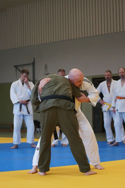 Zum Abschluss wurden die erlernten Techniken zu vollständigen Kombinationen zusammengefügt. Begonnen wurde bei jeder Kombinationen mit Schlägen, anschließend folgten angemessene Würfe und auch für den Boden zeigte Viktor noch einige technische Gemeinheiten. Auch hier lag sein Fokus klar darauf, logisch aufeinander aufbauende Techniken zu vermitteln. Selbst den weniger Erfahrenen gelang es so, am Ende eine dynamische Technik auszuführen, die sowohl kampf- als auch prüfungstauglich ist.