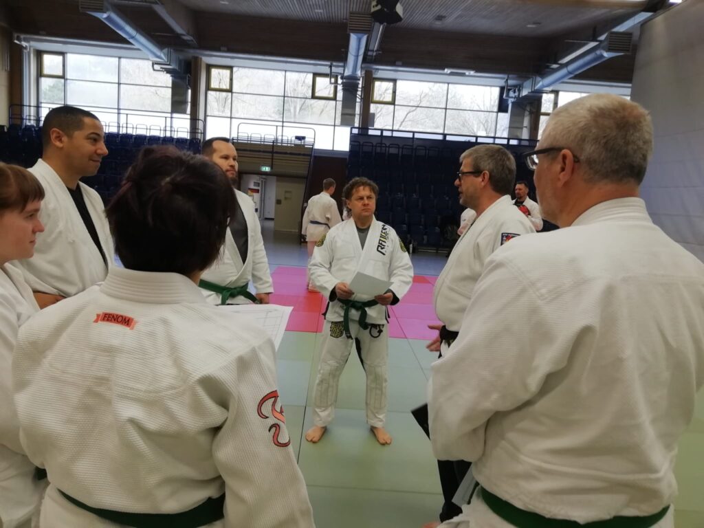 Am Nachmittag übernahmen Daniel Hellwig, Dirk Bänfer und Tim Lukas Vey und Martin Silbersack dann weiterhin die praktische Arbeit auf der Matte. In verschiedenen Einheiten wurden prüfungsrelevante Inhalte systematisch wiederholt, vertieft und individuell korrigiert.